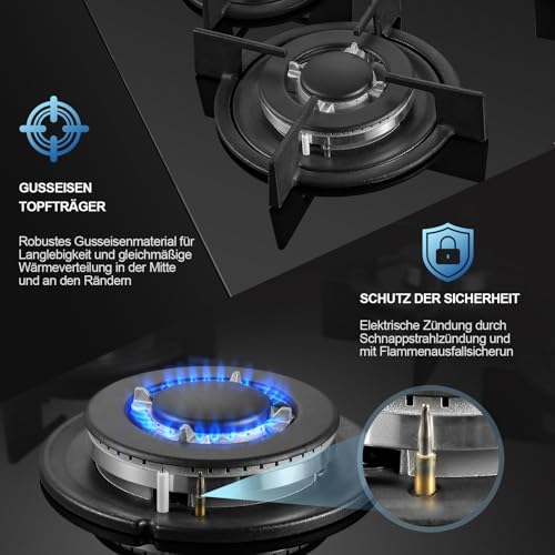 Doble Protección: Nuestra placa gas 4 fuegos ha pasado la certificación de seguridad CE, Cada quemador tiene protección termopar que corta automáticamente el suministro de gas si no se detecta una llama para evitar fugas de gas, Control de la perilla frontal con el diseño de bloqueo de protección infantil, que puede evitar que los niños toquen accidentalmente.
