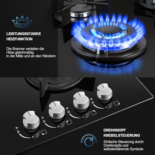 TopStrong Placa Gas 4 fuegos, Placa Gas Butano con Protección contra Llama, Encimera Gas Butano, Gas Natural/Propano Convertible, Superficie de Vidrio Templado, Negro, 8060W