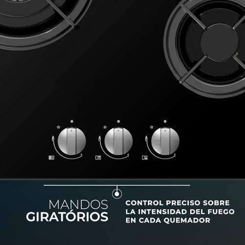 Placa preparada para gas butano con potencia total de 6050 W Incluye Kit de conversión a gas ciudad Cuenta con 3 quemadores de distinto tamaño, uno de ellos es quemador WOK de triple llama Estética cristal negro con parrillas forjadas Panel de control con mandos giratorios e ignición automática
