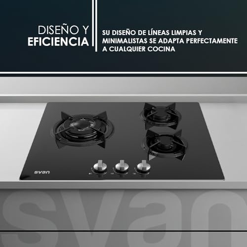 Svan Encimera de Gas SGW3601N. 3 Quemadores, Integrable, Quemador WOK triple llama, Acabado en Cristal negro